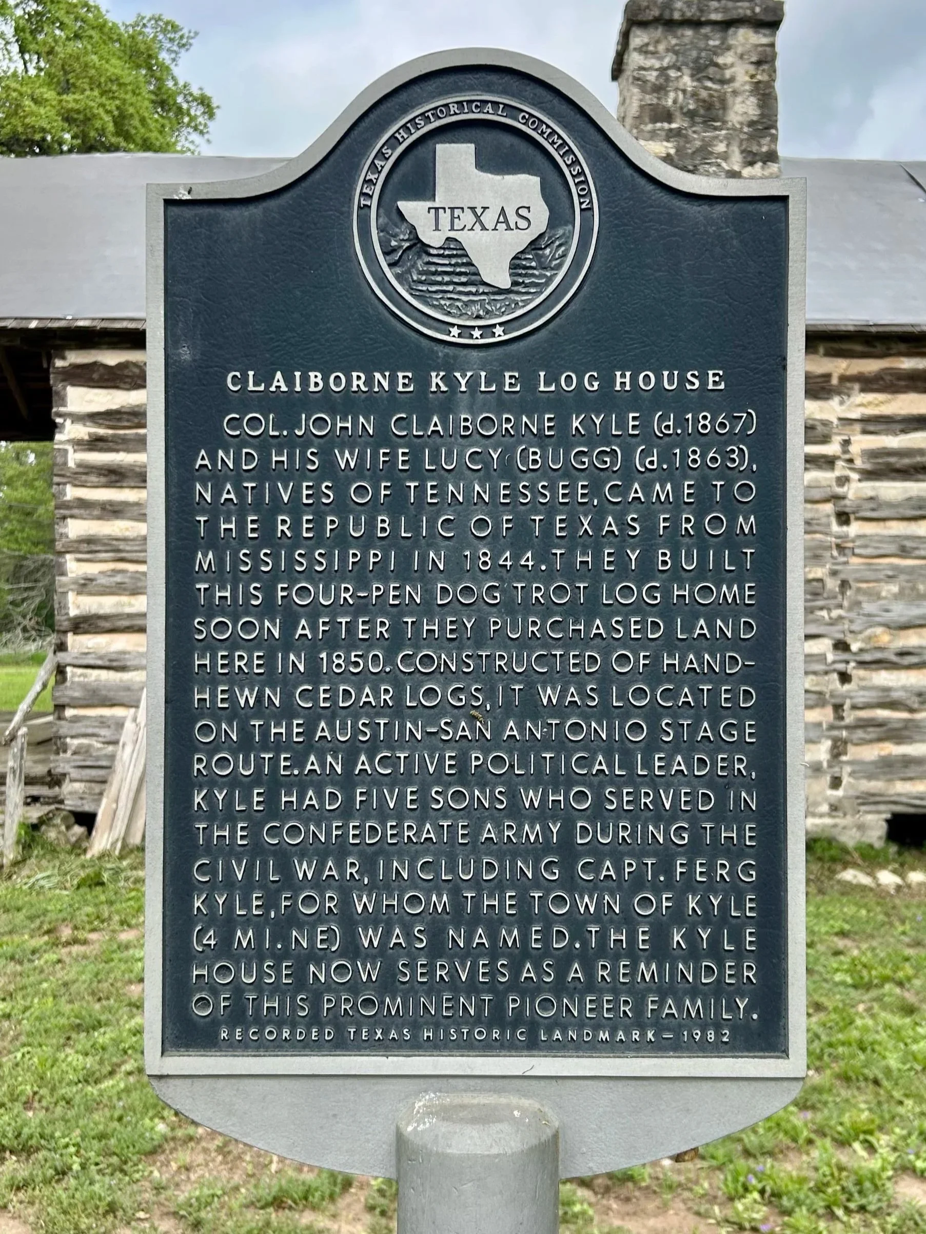 The circa 1850 Claiborne Kyle Log House is a rare four-pen dogtrot log home that still stands on its original site, perched on a bluff along the Blanco River near Kyle, Texas. This historic property is listed on the National Register of Historic Places, and is a designated State Antiquities Landmark, and Recorded Texas Historic Landmark. Owned by Hays County and managed by the Claiborne Kyle Log House Commission, the house is currently closed to the public for necessary repairs and maintenance.