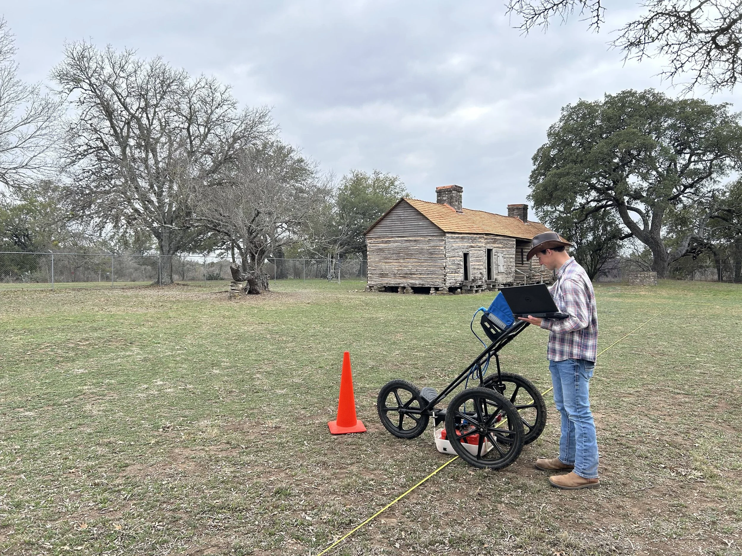Hays County hired ground-penetrating radar (GPR) specialist Dr. Michael Martin of Sidekick LLC to conduct a GPR investigation of the Kyle Log House site, seeking evidence of former outbuildings and other historic features associated with the ranch—including possible locations of a detached kitchen and dwellings once occupied by enslaved people on the property.