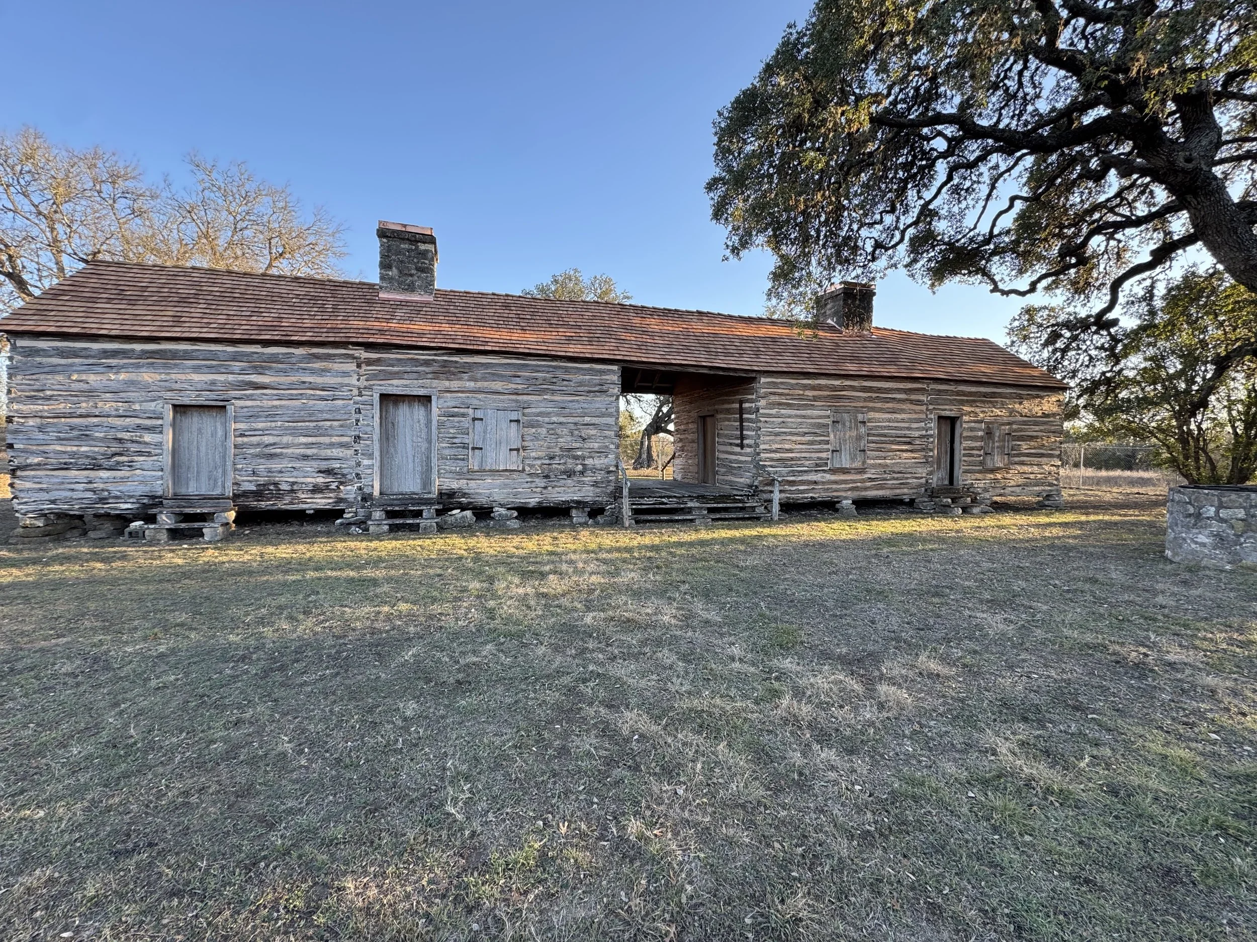 Built by Claiborne Kyle around 1850, this rare four-pen dogtrot log home still stands on its original site near Kyle, Texas.